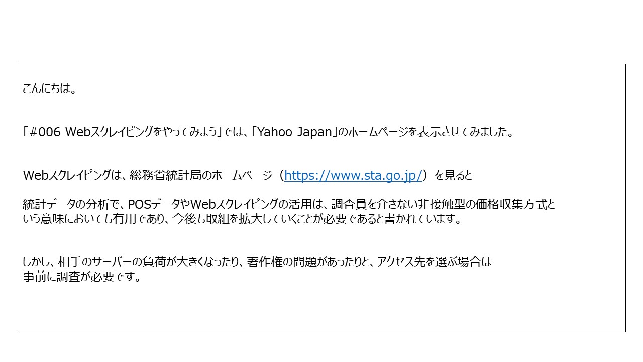 「#006 Webスクレイピングをやってみよう」では、「Yahoo Japan」のホームページを表示させてみました。
