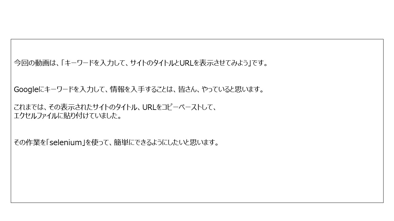 今回の動画は、「キーワードを入力して、サイトのタイトルとURLを表示させてみよう」です。
