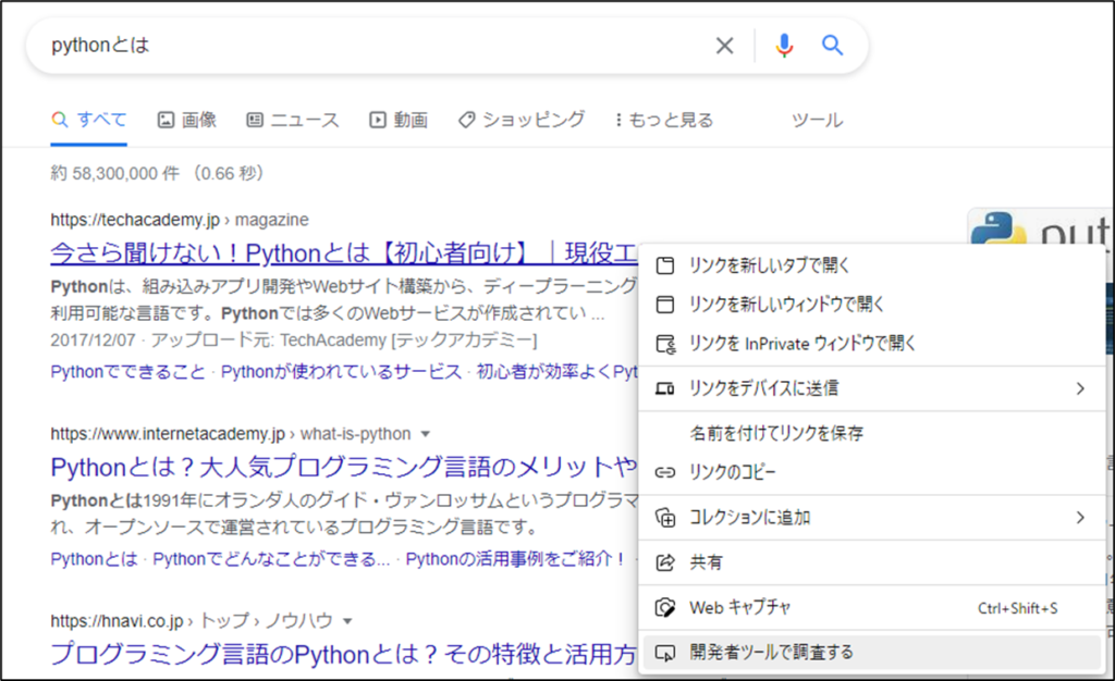 キーワード「Pythonとは」を検索ボックスに入力しキーワードを送ります。