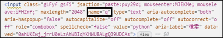 driver.find_element(By.NAME,〇〇)でname属性の値「q」を取得します。