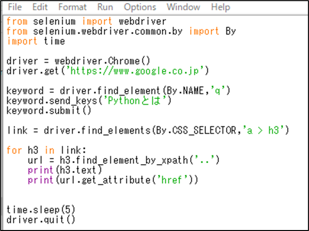 ライブラリ「selenium」から「webdriver」を取り込みます。