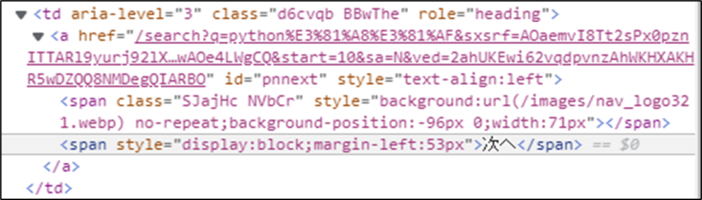 aタグのhref属性に次のページのURLの一部があるようです。これを取得するには、id = “penext”が
