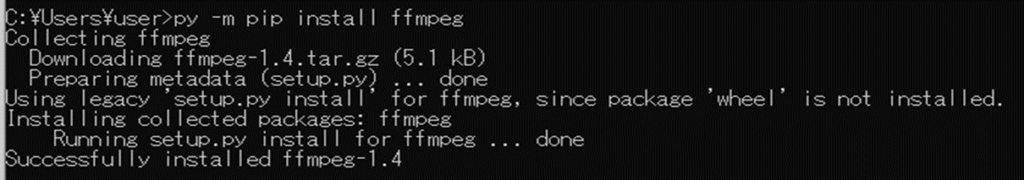 すると、下記のように表示されたので、「ffmpeg」のダウンロードが必要のようです。