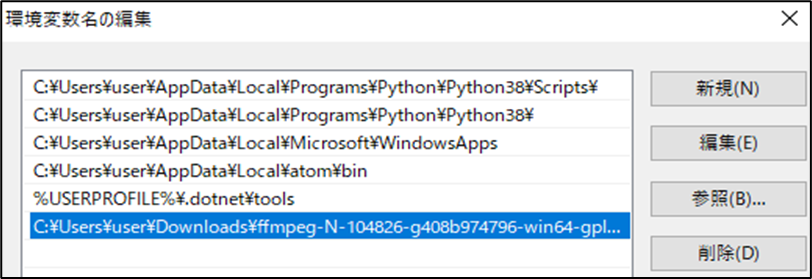 「システムの詳細設定」→「詳細設定」→「環境変数(N)…」→「ユーザー環境変数」にある「Path」を選択→「編集」→「新規」の順にクリックします。