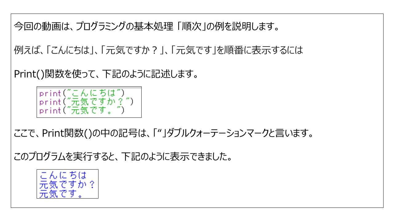 今回の動画は、プログラミングの基本処理 「順次」の例を説明します。