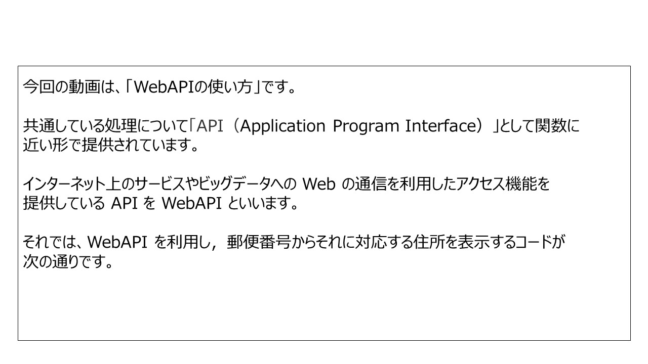 今回の動画は、「WebAPIの使い方」です。