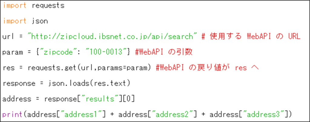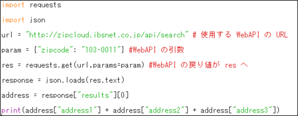 それでは、WebAPI を利用し,郵便番号からそれに対応する住所を表示するコードが