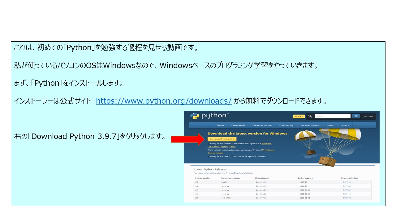 これは、初めての「Python」を勉強する過程を見せる動画です。