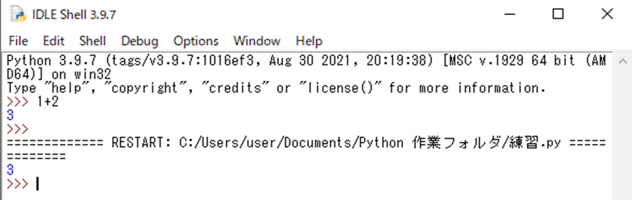 そうすると、Shell ウィンドウに実行結果が「3」と表示されます。